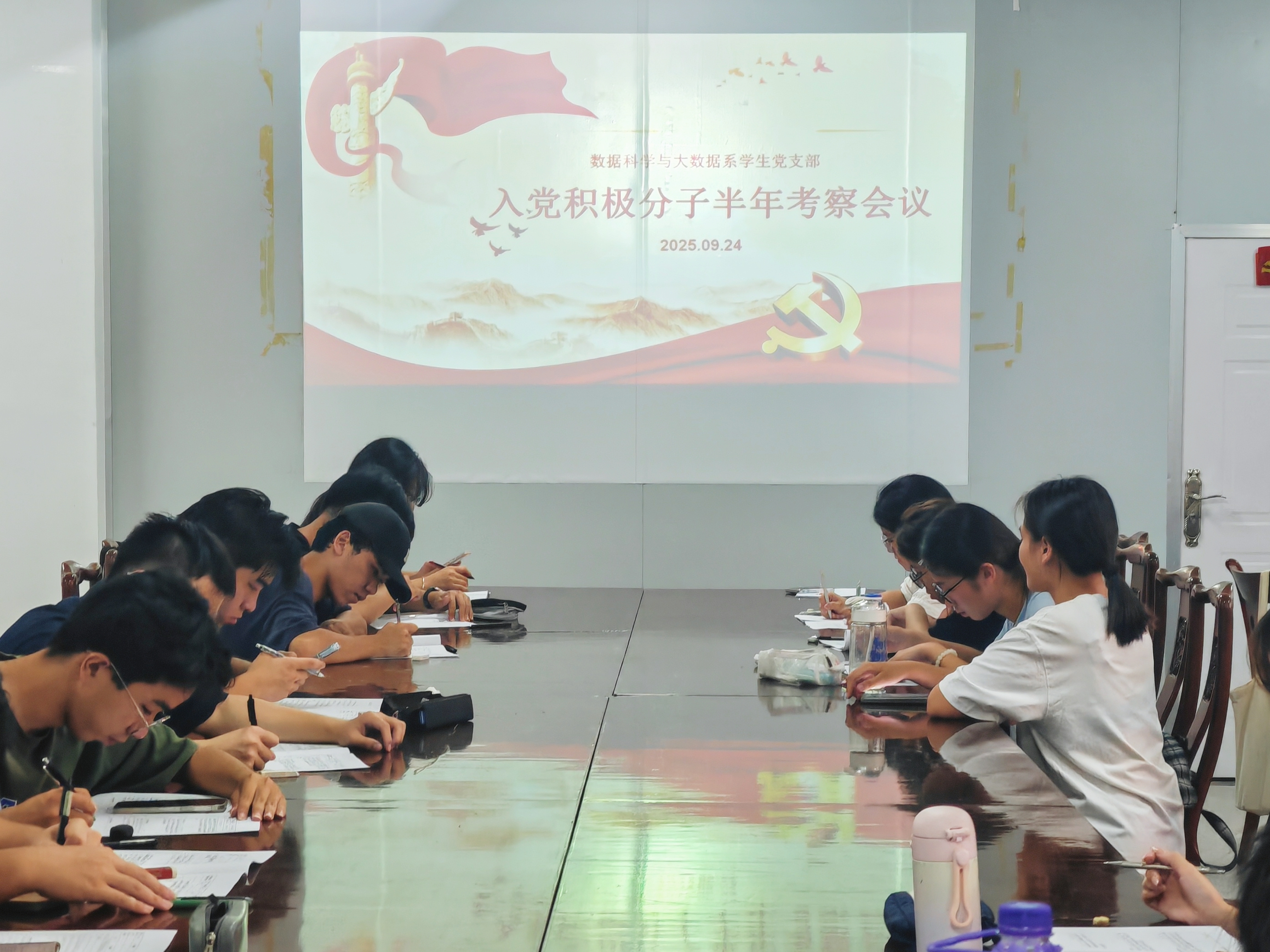 2025年9月24日,数据科学与大数据系员工党支部于泽钏楼四楼会议室开展入党积极分子半年考察会议暨主题教育专题党课。党支部书记庄秋荣老师等15名党员及25名入党积极分子参与此次大会。