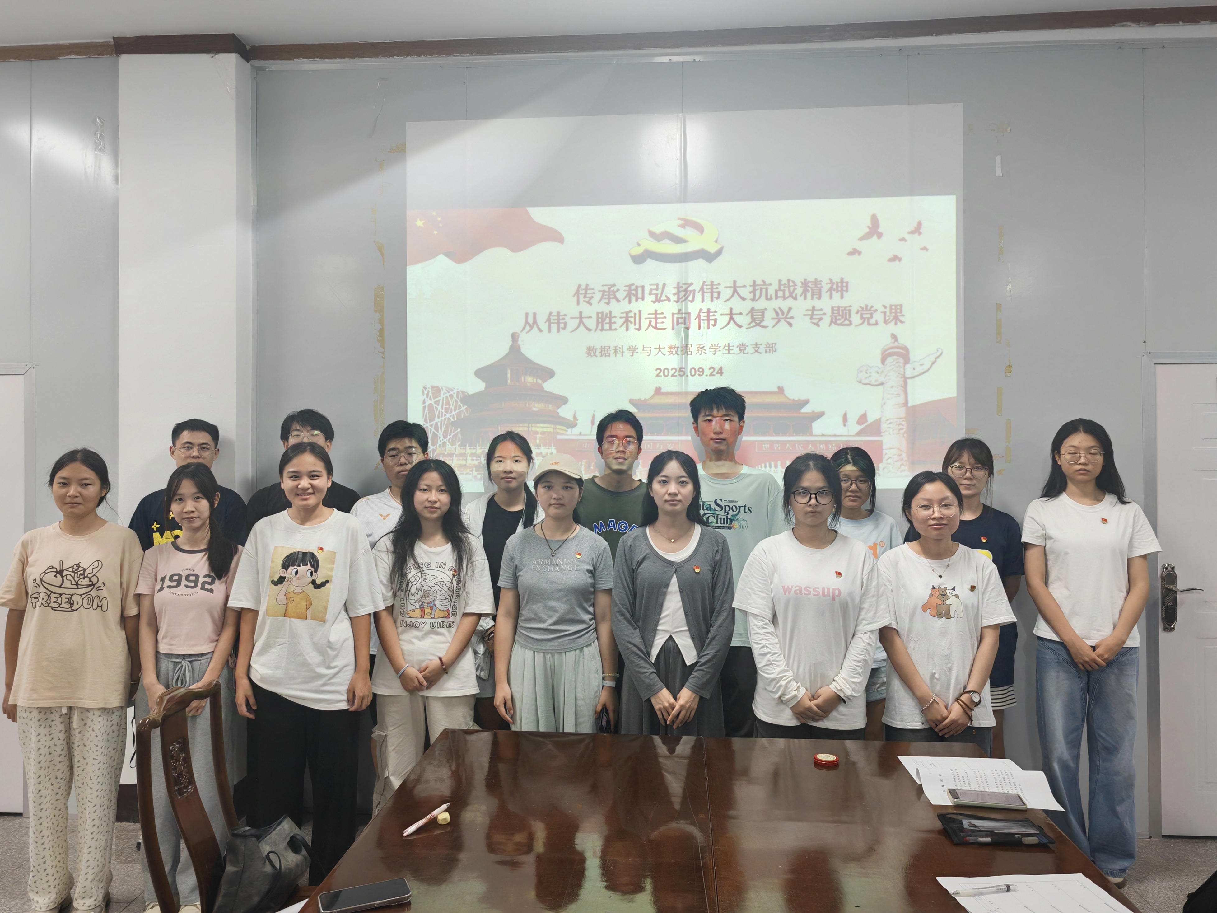 2025年9月24日,数据科学与大数据系员工党支部于泽钏楼四楼会议室开展“传承和弘扬伟大抗战精神,从伟大胜利走向伟大复兴”专题党课。庄秋荣深入解读伟大抗战精神的内涵,并详细分析了从伟大胜利走向伟大复兴的必然逻辑。她强调青年党员应当走进历史、读懂精神,深入学习伟大抗战精神的丰富内涵与时代价值,从抗日战争的伟大胜利中,汲取攻坚克难、奋勇向前的磅礴力量,为实现中华民族伟大复兴的中国梦筑牢思想根基。