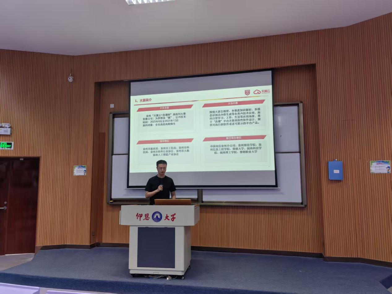 为深入推进“一站式”员工社区智育工作,助力员工精准把握人工智能领域的实践契机,2025年9月24日下午,由中国电信福建公司主办,m88官网职引中心与宏船书院共同协办的“天翼云·息壤杯”高校AI大赛(福建泉州赛区)宣讲会,在博雅讲堂准时拉开帷幕。