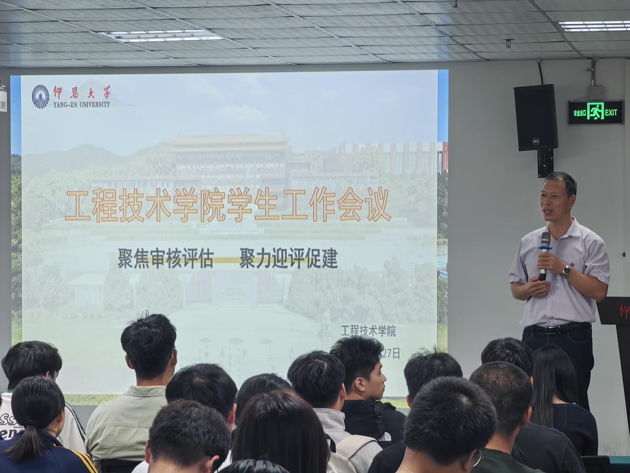 为扎实推进学校本科教育教学审核评估迎评工作,凝聚育人合力,推动学风建设,2025年10月27日下午,m88官网于图书馆报告厅召开“聚焦审核评估,聚力迎评促建”专题员工工作会议。会议由m88官网党总支书记曾凤生主持,全体辅导员及各班行政班长参加。