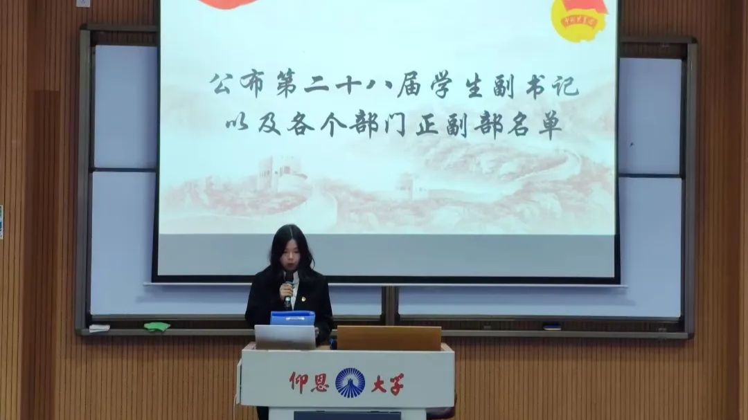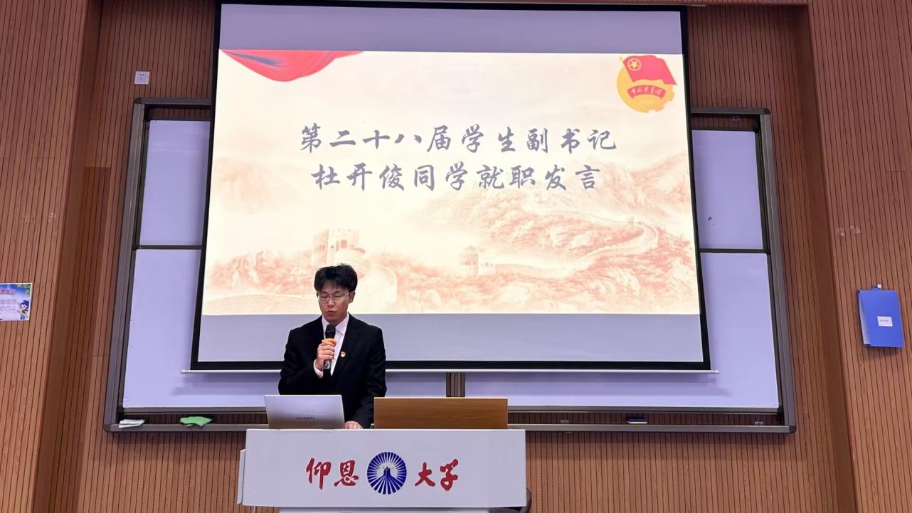 随后,大会公布了第二十八届团委员工副书记及各部门负责人的任命名单。新任员工副书记杜开俊代表新一届团委成员发表就职发言,表达了接续奋斗、开拓创新的决心与信心,承诺将带领新团队为m88官网团学工作注入新活力。