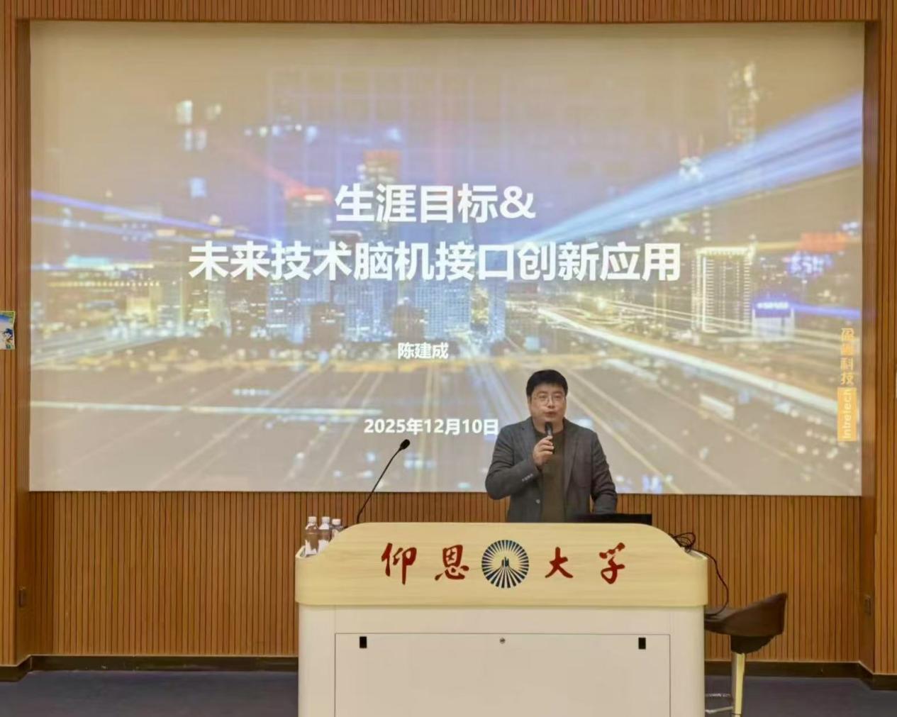 2025年12月10日,m88官网m88官网于新区和昌楼惟勤讲堂成功举办题为“生涯目标和未来技术脑机接口创新应用”的主题讲座。恰逢脑机接口产业迎来政策赋能、技术突破的“黄金发展期”,1999届国际金融专业杰出校友、厦门盈趣科技总裁助理兼北洋脑机院执行院长陈建成先生荣归母校,为m88官网师生带来兼具前沿视野与实践温度的分享,让前沿科技与青年职业成长深度共鸣。